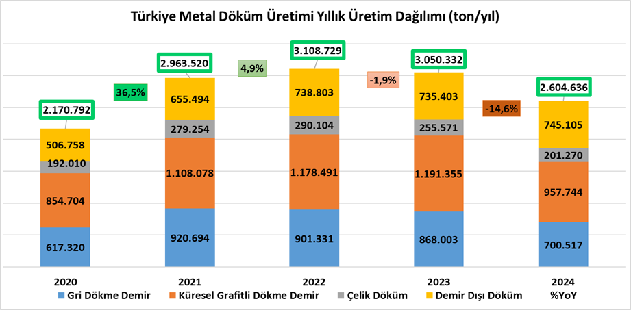 Türkiye’nin 2024 metal döküm üretimi, bir önceki yıla kıyasla yüzde 14,6 oranında düşüşle 2,6 milyon ton olarak gerçekleşti. Demir döküm üretimindeki düşüş, genel üretim daralmasının temel nedeni oldu. Demir döküm üretimi %19,7 oranında azalarak yaklaşık 1,86 milyon ton seviyesine geriledi. Gri dökme demir üretiminde %19,3, sfero döküm üretiminde ise %19,6 düşüş yaşandı.